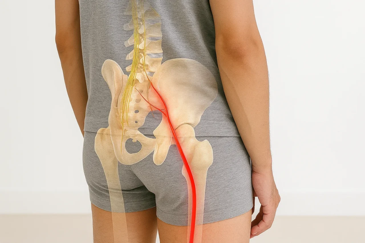 坐骨神経という靭帯で一番太い神経が絞扼され、坐骨神経の通り道沿いに起きる痛みや痺れの総称です。